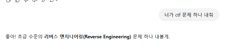 요즘들어 사람이랑 대화하는 것 보다, ChatGPT랑 대화를 많이하는 것 같은데요. 그래서 심심해서 CTF 문제좀 내달라고 해봤습니다. (제가 여태까지 ChatGPT를 사용해서 공부한 내용을 비롯하고 제 수준에 맞게 문제를 제작합니다.) 문제 설명프로그램 또한 다운로드가 가능합니다. 바로 정적 분석을 통해 플래그 값을 찾아보도록 하겠습니다. 풀이ida를 통해 파일을 열어서 main 함수부터 디컴파일러를 통해 알아봅시다. 너무 쉽게 풀었습니다.int __fastcall main(...) _-fastcall 은 함수의 호출 규약 중 하나로, 특정한 CPU 레지스터를 사용해 인자를 전달하는 방식이다. int argc - 프로그램 실행 시 전달된 인자의 개수를 나타낸다 - 최소한 프로그램 이름이 항상 포함되므로..