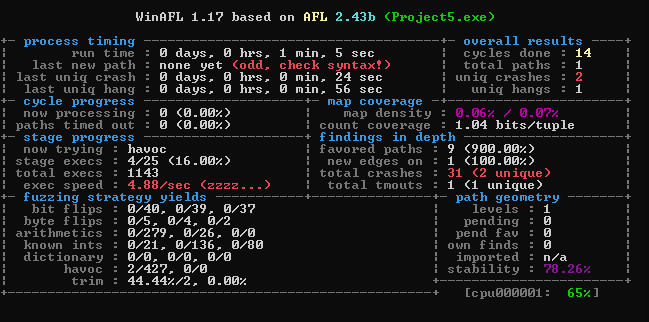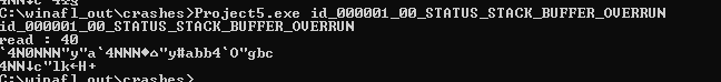afl-fuzz.exe -D C:\Users\user\Downloads\DynamoRIO\bin64 -i "C:\\winafl_in" -o "C:\\winafl_out" -t 1000 -- -coverage_module Project4.dll -target_module Project5.exe -target_method fuzzme -fuzz_iterations 10 -nargs 1 -- C:\winafl\build64\bin\Release\\Project5.exe @@