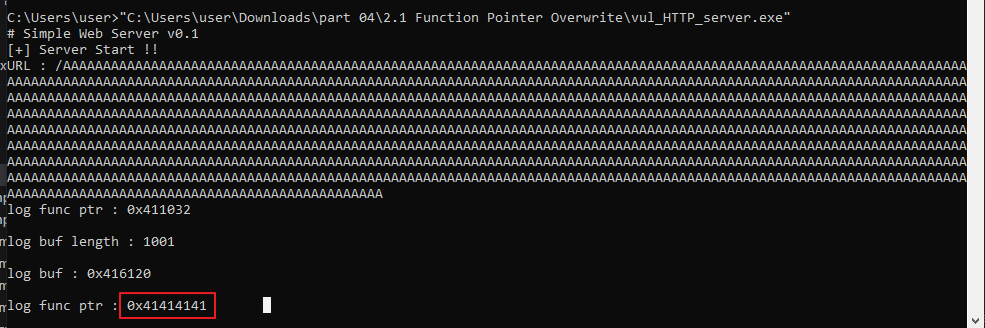 위에 코드를 실행 하면 함수 포인터가 0x41414141로 바꼇습니다.