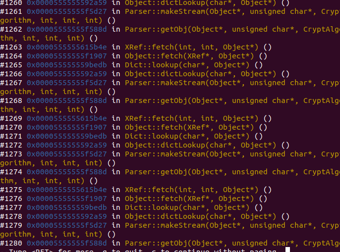 xpdf 4.01.01에서 parser.cc의 parset::getObj() 함수가 조작된 파일을 통해서 무한 재귀를 유발한다고 합니다.